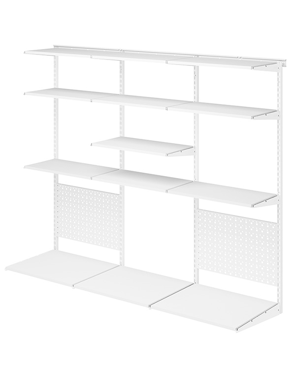В комплект входят несущие рельсы и навесные направляющие, полки, штанги, аксессуары, крепежные элементы. Можно докупить множество дополнительных компонентов для гардеробной системы.