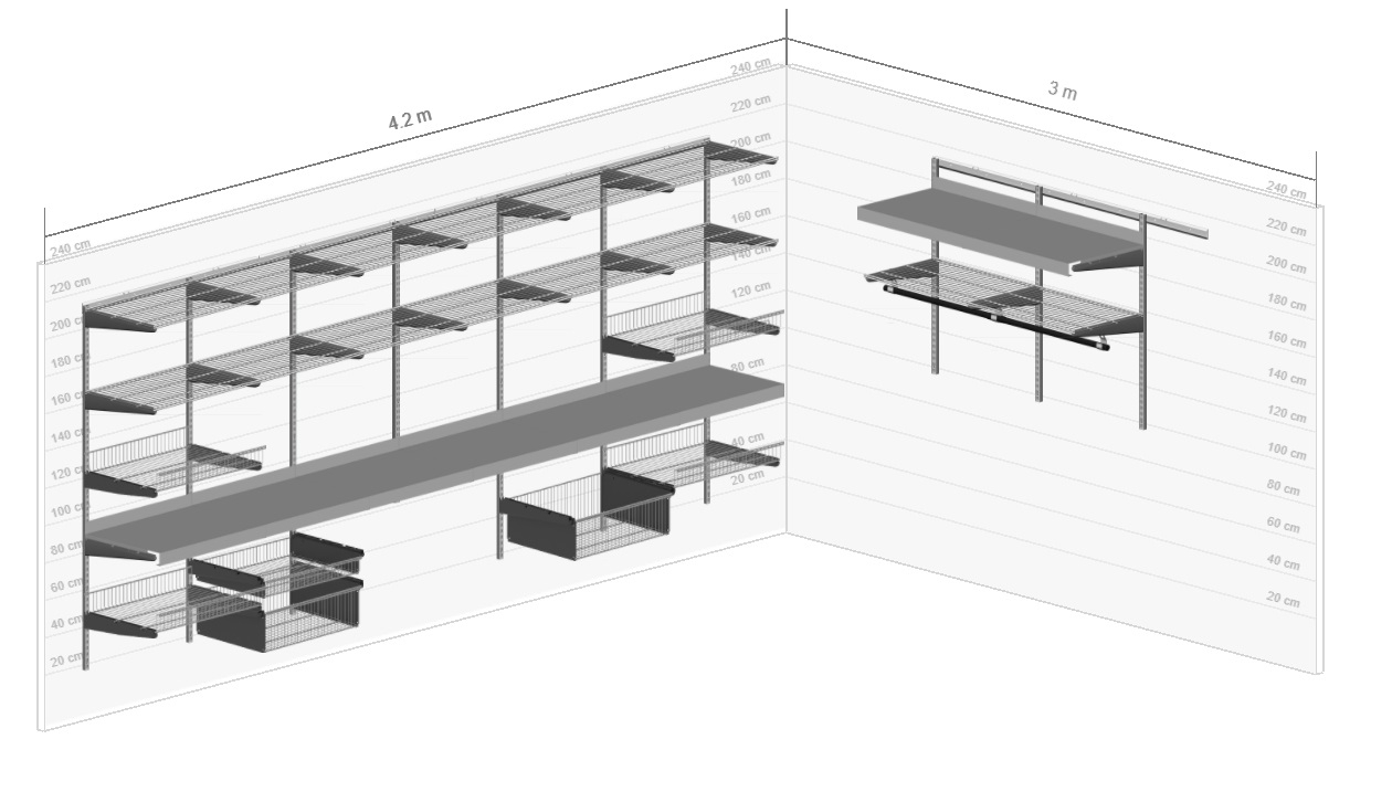 В комплект входят несущие рельсы и навесные направляющие, полки, штанги, аксессуары, крепежные элементы. Можно докупить множество дополнительных компонентов для гардеробной системы.