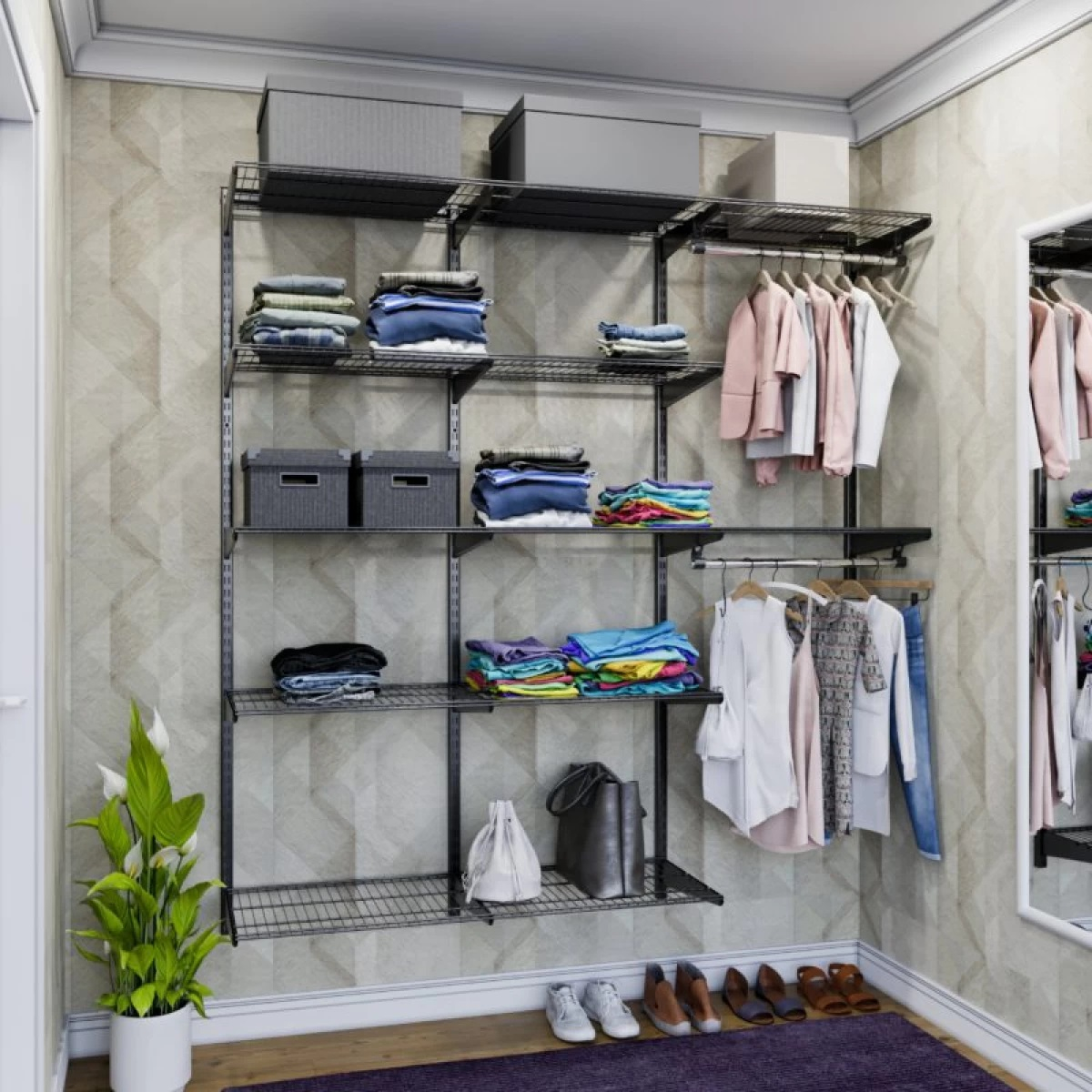 Базовый комплект гардеробной системы GS - это готовое решение для квартиры, дачи, гаража, обеспечивающее удобное хранение вещей. Система собирается в 6 разных конфигурациях, что позволяет подстраивать ее под размеры помещения и ориентироваться на личные пожелания по расположению отдельных элементов. В комплект входят несущие рельсы и навесные направляющие, полки, штанги, аксессуары, крепежные элементы. Можно докупить множество дополнительных компонентов для гардеробной системы.
