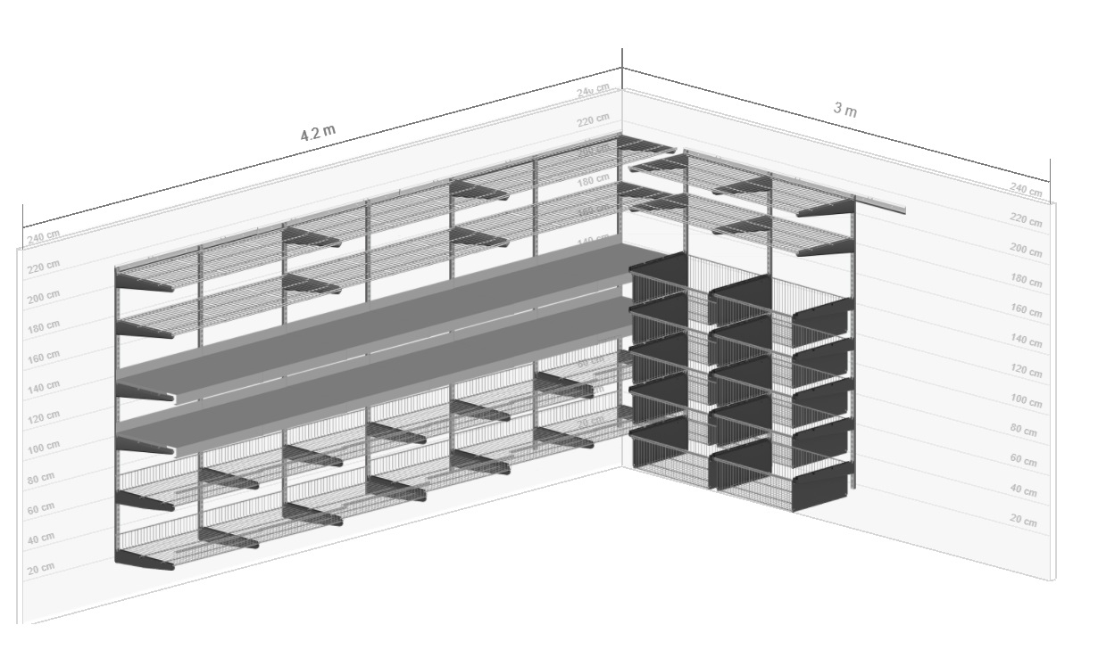 Базовый комплект гардеробной системы GS - это готовое решение для квартиры, дачи, гаража, обеспечивающее удобное хранение вещей. Система собирается в 6 разных конфигурациях, что позволяет подстраивать ее под размеры помещения и ориентироваться на личные пожелания по расположению отдельных элементов. В комплект входят несущие рельсы и навесные направляющие, полки, штанги, аксессуары, крепежные элементы. Можно докупить множество дополнительных компонентов для гардеробной системы.