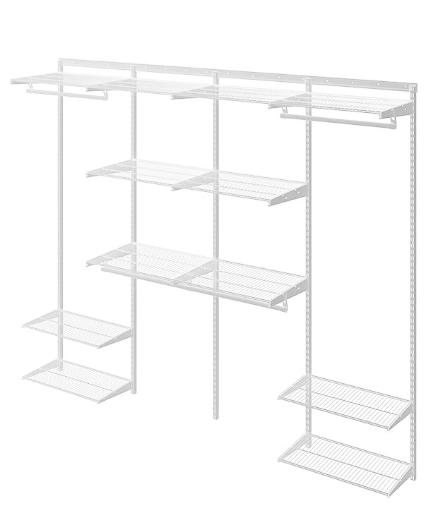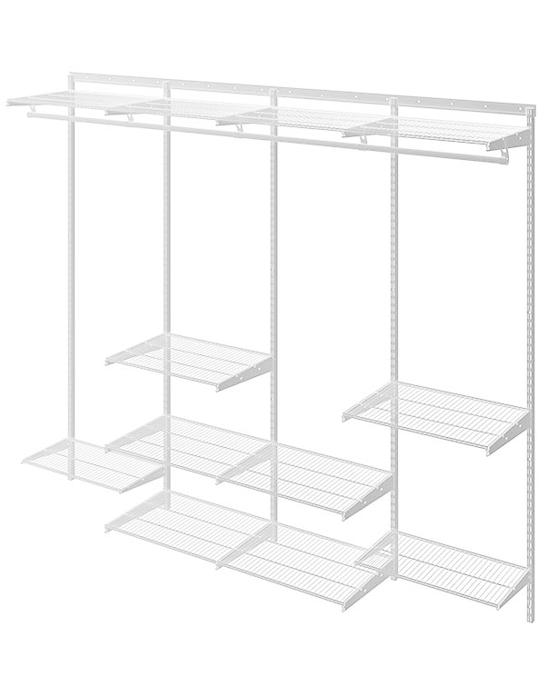 В комплект входят несущие рельсы и навесные направляющие, полки, штанги, аксессуары, крепежные элементы. Можно докупить множество дополнительных компонентов для гардеробной системы.