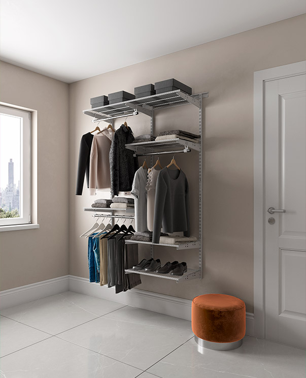 В комплект входят несущие рельсы и навесные направляющие, полки, штанги, аксессуары, крепежные элементы. Можно докупить множество дополнительных компонентов для гардеробной системы.