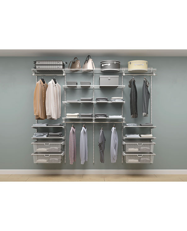 В комплект входят несущие рельсы и навесные направляющие, полки, штанги, аксессуары, крепежные элементы. Можно докупить множество дополнительных компонентов для гардеробной системы.