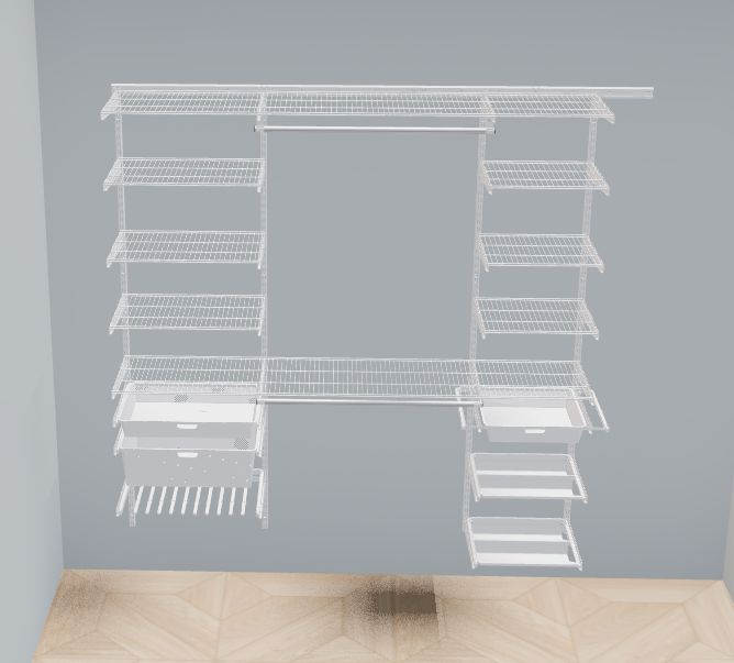В комплект входят несущие рельсы и навесные направляющие, полки, штанги, аксессуары, крепежные элементы. Можно докупить множество дополнительных компонентов для гардеробной системы.