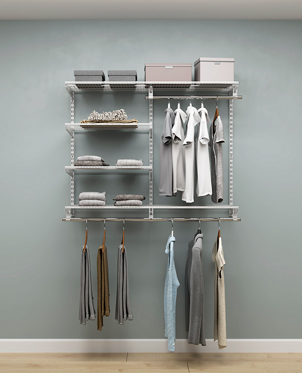 В комплект входят несущие рельсы и навесные направляющие, полки, штанги, аксессуары, крепежные элементы. Можно докупить множество дополнительных компонентов для гардеробной системы.