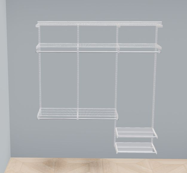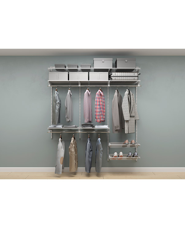 В комплект входят несущие рельсы и навесные направляющие, полки, штанги, аксессуары, крепежные элементы. Можно докупить множество дополнительных компонентов для гардеробной системы.