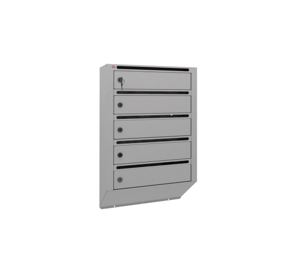 5-х секционный почтовый ящик для подъездов многоквартирных домов серии «Гарант Люкс». Почтовый ящик «Гарант Люкс» имеет усиленную конструкцию корпуса и выполнен из холоднокатанной стали. Дверцы почтового ящика имеют толщину металла 1 мм. Открытие дверок производится слева направо. Конструкция почтового ящика предусматривает возможность перевешивания дверок на противоположную сторону (справа налево). Корреспонденция располагается в секции под углом 50 градусов.