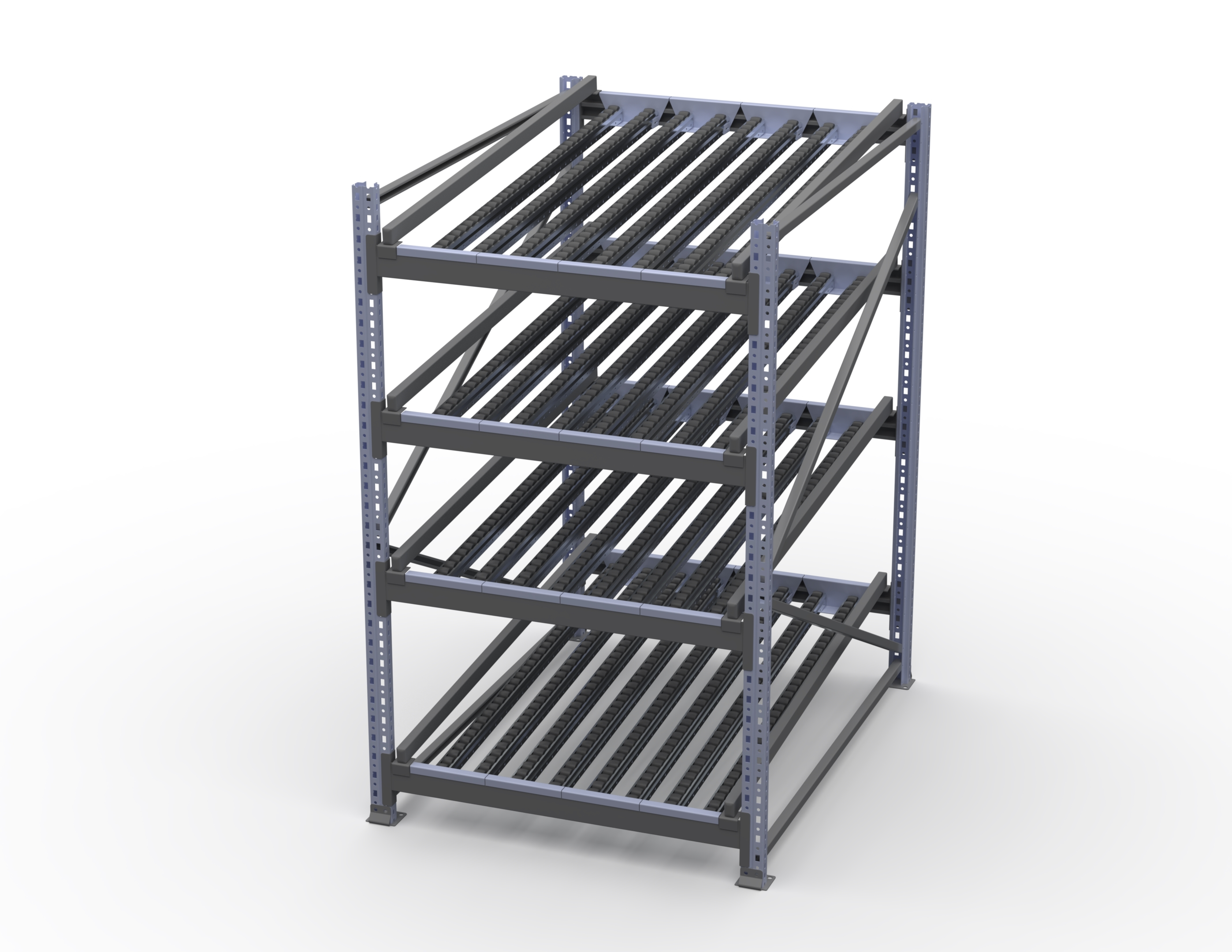 Гравитационный стеллаж с роликовыми полками 1600х900х1300, 4 яруса