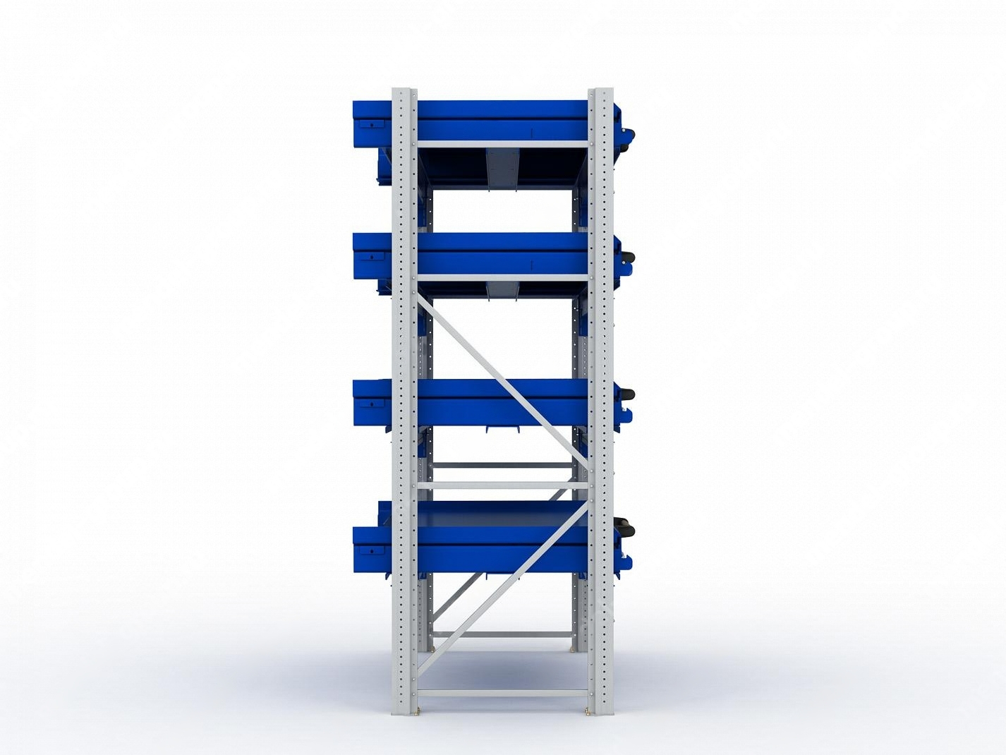 - Основная секция стеллажа с четырьмя ярусами хранения и четырьмя выкатными платформами, нагрузкой до 1000 кг/платформу