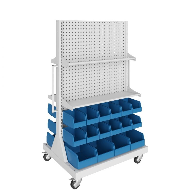 Вместительные пластиковые контейнеры размещаются на 3 ярусах мобильной стойки.