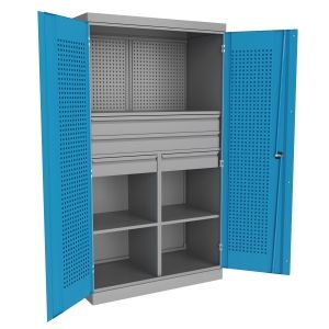 Максимальная распределенная нагрузка на шкаф составляет 400кг. Максимальная равномерно распределённая нагрузка на полку 50кг, выдвижной ящик 40кг. Шкаф оснащен замком «Евролок». Окраска элементов корпуса осуществляется порошковой полимерной краской: RAL 7037 (пыльно-серый), а дверцы RAL 5015 (небесно-синий) – складская программа, RAL 3003 (красный) – под заказ. Все шкафы отгружаются со склада в разобранном виде. Инструкцию по сборке вы можете скачать с нашего сайта.