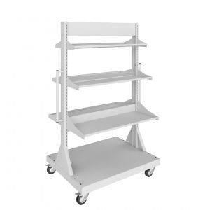 Стойка на базе платформы Constructor оснащена двумя навесными полками SP401 с допустимой нагрузкой до 30 кг, двумя навесными полками SP402 с допустимой нагрузкой до 40 кг и двумя навесными полками SP403 с допустимой нагрузкой до 50 кг для размещения, хранения и перемещения инструментов и приспособлений как использованием пластиковых контейнеров, так и бех них.
