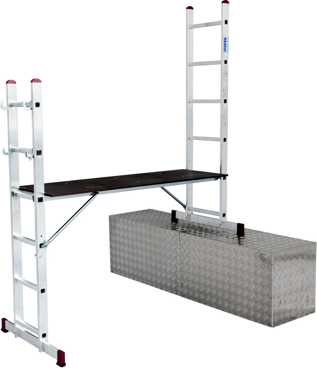 | • Допустимая нагрузка до 200 кг/м2 • Погодостойкий противоскользящий настил из панели, пропитанной фенольной смолой • Быстрый монтаж без инструментов, алюминиевые подмости состоят только из 5 элементов • Небольшие размеры позволяют свободно проезжать через дверные проемы в собранном состоянии • Благодаря изменению высоты платформы с интервалом от перекладины к перекладине возможна установка подмостей на лестницах и уступах • Идеальны для внутренних работ |