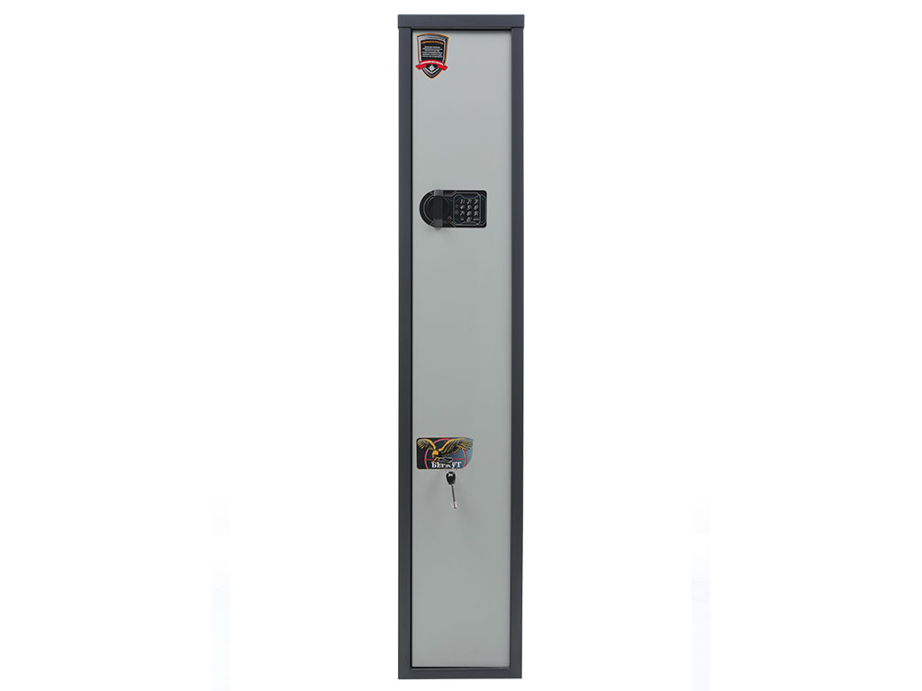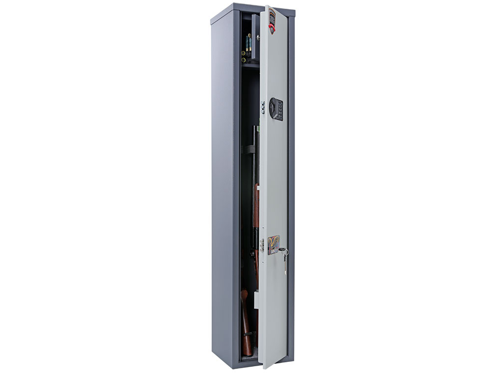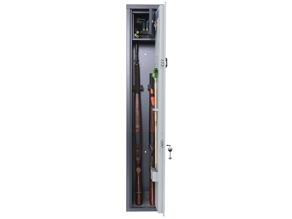 Толщина металла корпуса и двери – 2 мм оборудованы патронным отделением, запирающимся на ключ, и ложементами для ружей