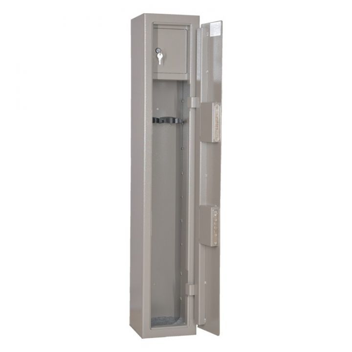 Сейф на 2 ружья оснащен отделением под патроны. Ложементы — металлические держатели с резиновыми роликами. Максимальная высота устанавливаемого оружия — 1200 мм. Два замка ЗАО «Про-Сам» г. Рязань или аналогичные замки другого производителя.