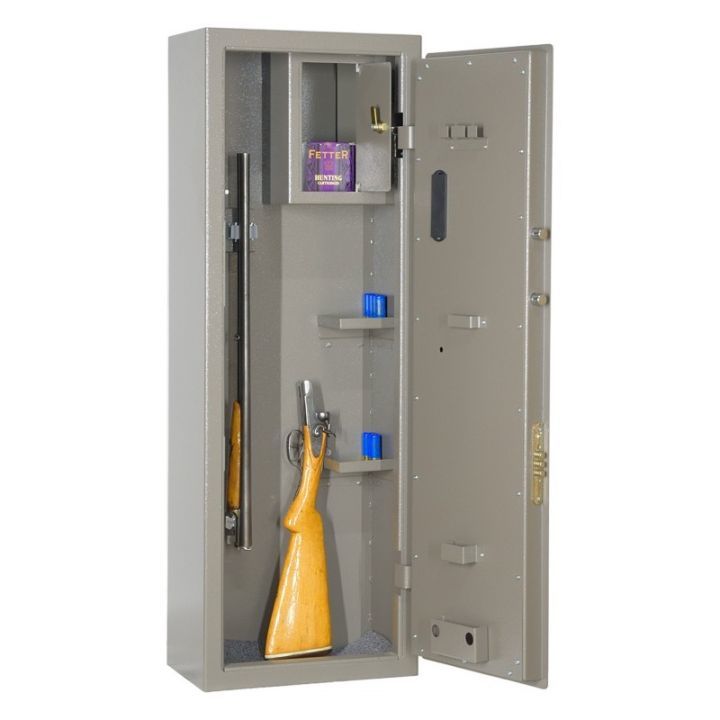 Шкаф односекционный, на 2 ствола оснащен съемными полками и отделением под патроны. Ложементы — металлические держатели с резиновыми роликами. Максимальная высота устанавливаемого оружия — 1130 мм. Один замок ЗАО «Про-Сам» г. Рязань или аналогичный замки другого производителя. Второй замок кодовый электронный.