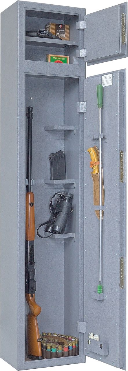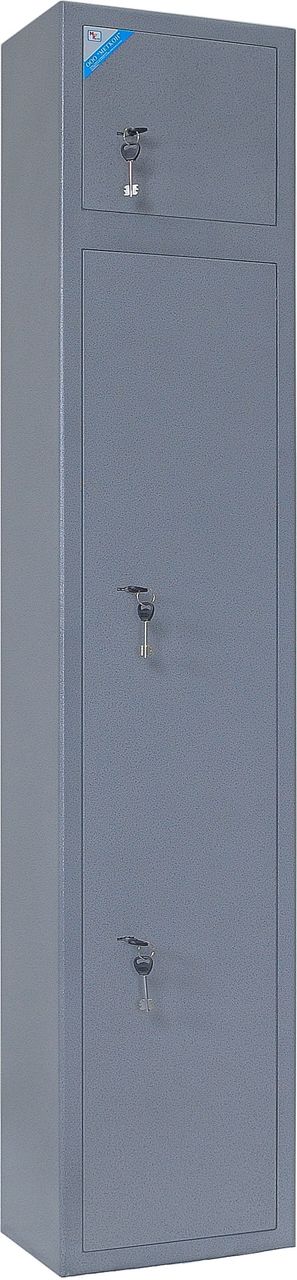 Сейф двухсекционный, на 2 ствола оснащен съемными полками и отдельной секцией под патроны. Максимальная высота устанавливаемого оружия — 1380 мм. Ложементы — металлические держатели с резиновыми роликами. Три замка ЗАО «Про-Сам» г. Рязань или аналогичные замки другого производителя.