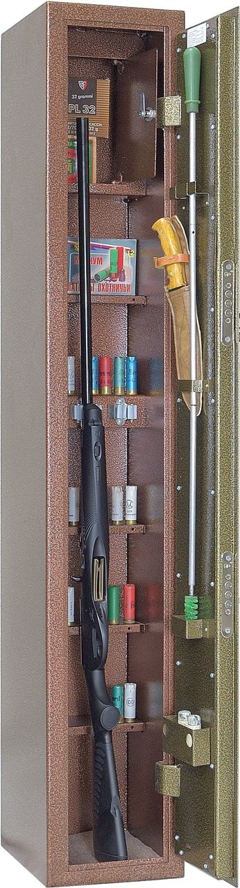 Сейф односекционный, на 3 ствола оснащен съемными полками и отделением под патроны. Ложементы — металлические держатели с резиновыми роликами. Максимальная высота устанавливаемого оружия — 1480 мм. Два замка ЗАО «Про-Сам» г. Рязань или аналогичные замки другого производителя.