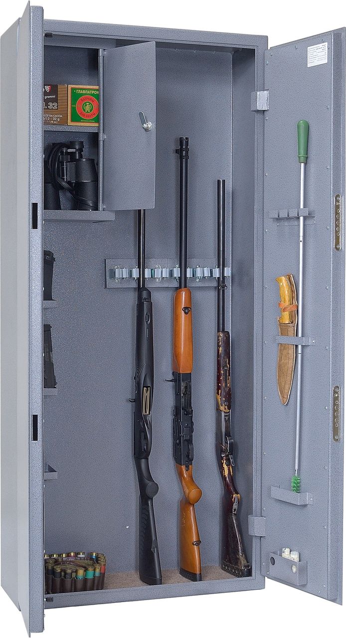 Сейф односекционный, на 6 стволов оснащен съемными полками и отделением под патроны. Ложементы — металлические держатели с резиновыми роликами. Два замка ЗАО «Про-Сам» г. Рязань или аналогичные замки другого производителя.