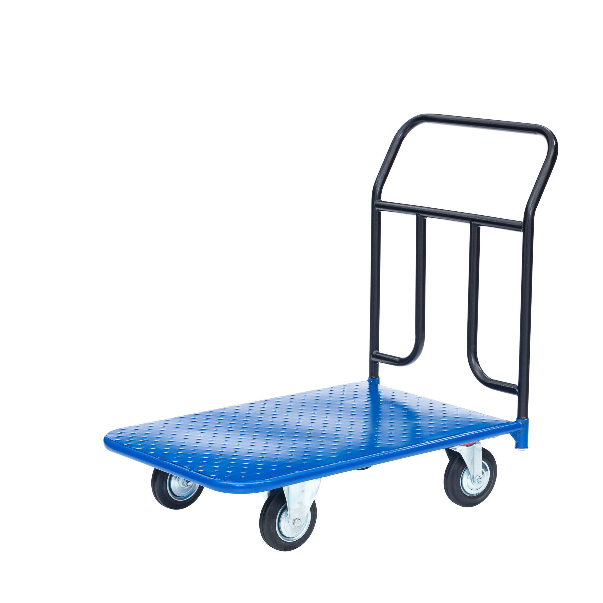 Платформенная 4-х колесная тележка КП-350 (600х1200) используется для перемещения различных грузов в складских помещениях. Ручка крепится к платформе болтами, для компактного хранения можно снять, высота ручки 750мм. Платформа имеет уникальную рельефную, полимерную, противоскользящую поверхность. Цвет синий, шагрень. Для легкого перемещения тележка КП-350 комплектуется 2 поворотными и 2 неповоротными колесами, изготовленными из высококачественной литой резины.