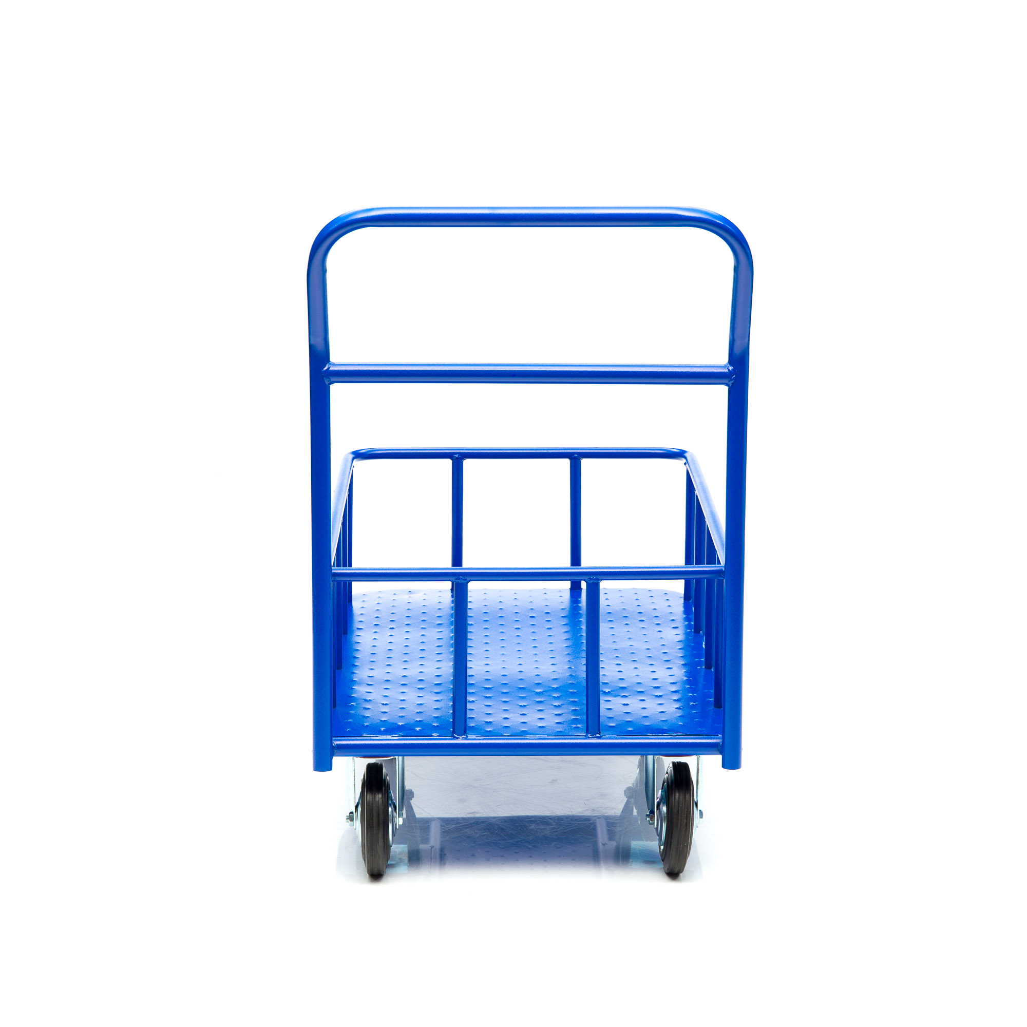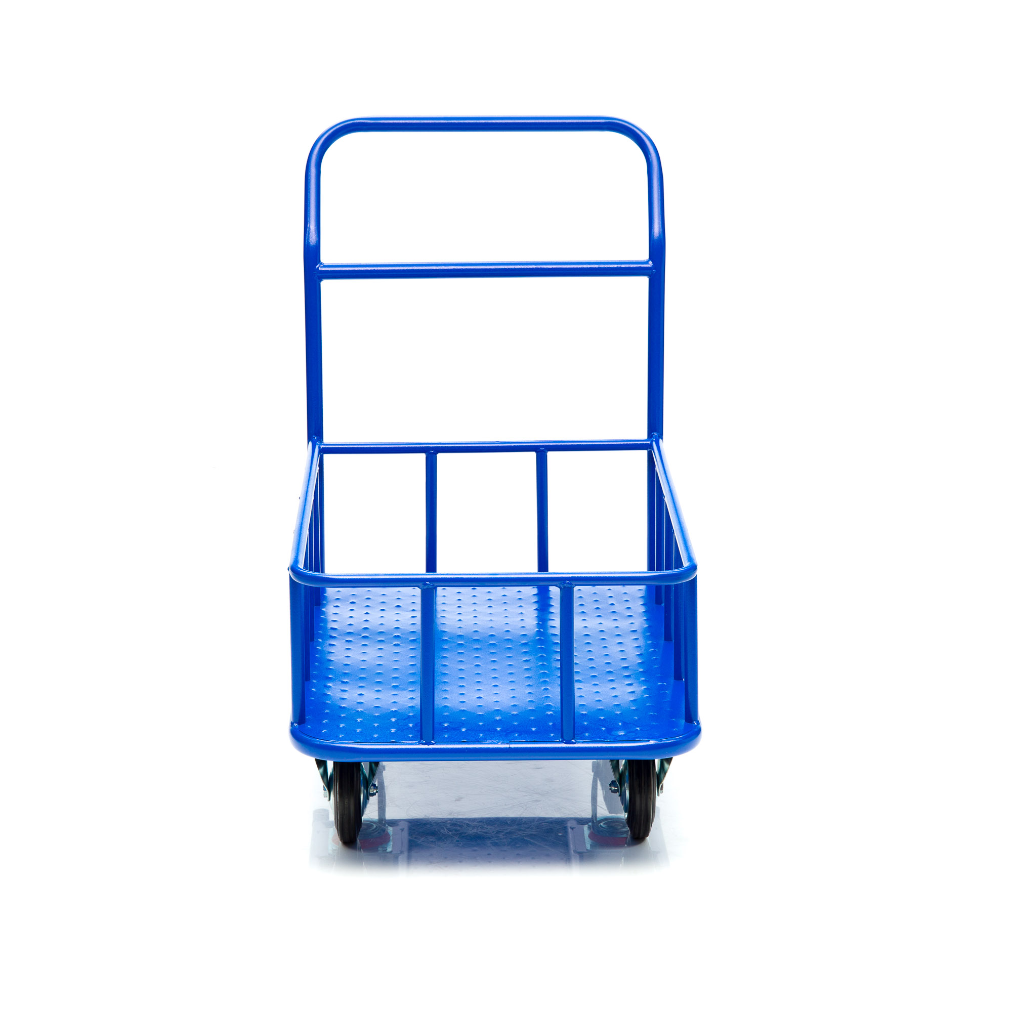 Платформенная 4-х колесная тележка КПБ-300 (с бортом) (600х900) используется для перемещения различных грузов, как в промышленности, так и в условиях склада или вокзала. Конструкция тележки цельносварная. Размер платформы 600х900мм., высота борта 150мм., высота ручки 750мм., Платформа имеет уникальную рельефную полимерную противоскользящую поверхность. Цвет синий, шагрень. Для легкого перемещения тележка КПБ-300 комплектуется 2 поворотными и 2 неповоротными колесами, изготовленными из высококачественной литой резины. Малые габариты, удобная ручка и поворотные колеса обеспечивают высокую мобильность средства, 4 точки опоры гарантируют устойчивость тележки, а наличие невысоких бортов гарантирует безопасность перевозимого хрупкого и мелкоштучного груза.