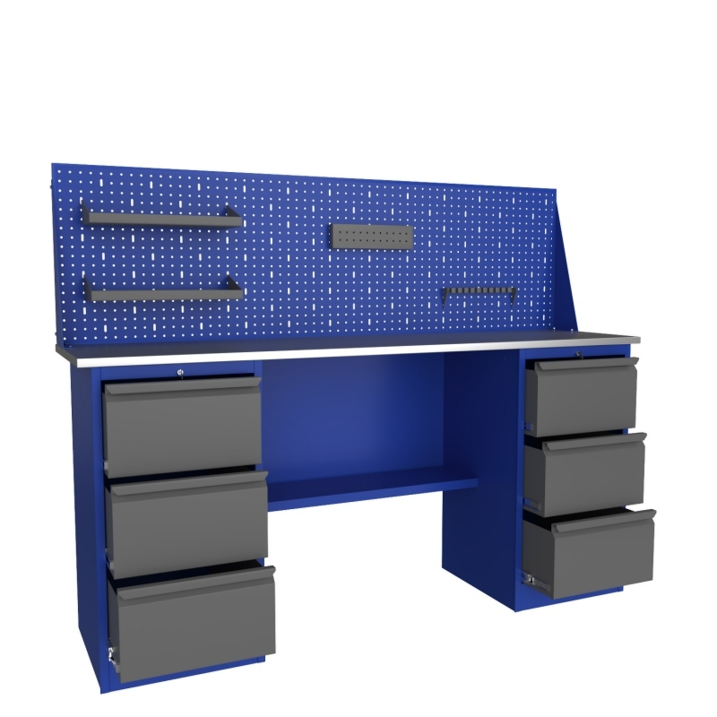 В качестве опор служат две тумбы. Они оснащены тремя ящиками, центральным замком. Верстак имеет экран, который содержит удобные подвески для инструментов. Изделие покрыто качественной порошковой краской, которая не трескается со временем.