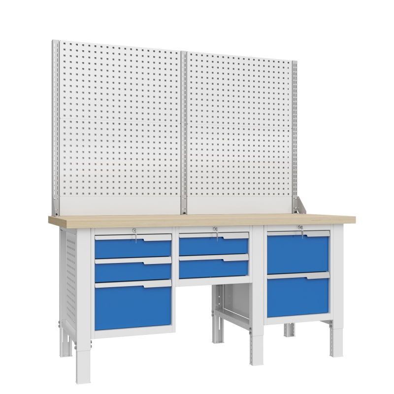 Регулировка рабочего места по высоте осуществляется в диапазоне от 700 до 950мм с шагом 25мм. Предусмотрена возможность тонкой регулировки усиленным резьбовым подпятником. Нагрузка на ящики верстака - до 40 кг, на полки - до 60кг. Общая распределенная нагрузка на рабочую поверхность 1500кг. Имеет возможность стыковки в единую рабочую поверхность с верстаками серии CTR