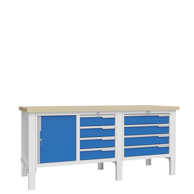 Регулировка рабочего места по высоте осуществляется в диапазоне от 700 до 950мм с шагом 25мм. Предусмотрена возможность тонкой регулировки усиленным резьбовым подпятником. Нагрузка на ящики верстака - до 40 кг, на полки - до 60кг. Общая распределенная нагрузка на рабочую поверхность 1500кг. Имеет возможность стыковки в единую рабочую поверхность с верстаками серии CTR