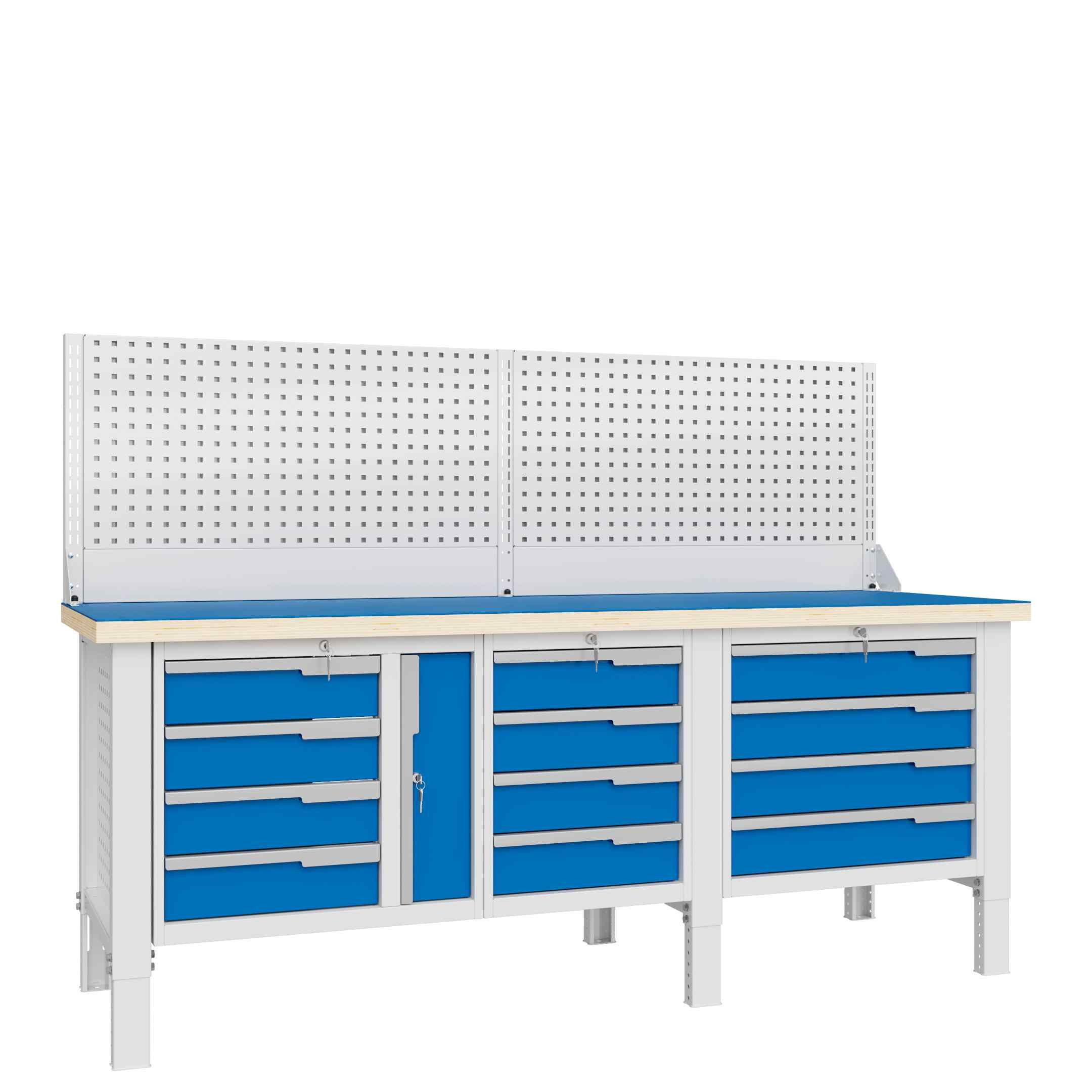Регулировка рабочего места по высоте осуществляется в диапазоне от 700 до 950мм с шагом 25мм. Предусмотрена возможность тонкой регулировки усиленным резьбовым подпятником. Нагрузка на ящики верстака - до 40 кг, на полки - до 60кг. Общая распределенная нагрузка на рабочую поверхность 1500кг. Имеет возможность стыковки в единую рабочую поверхность с верстаками серии Constructor