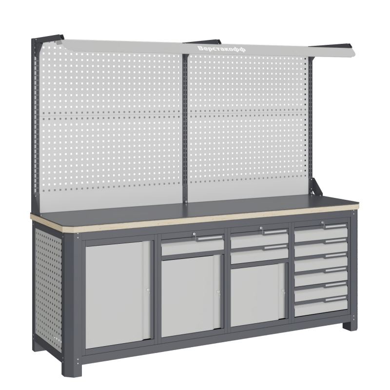 Экран (перфорированная панель) верстака выполнен с квадратной перфорацией 12х12 мм с шагом 38 мм для установки крючков, держателей и других аксессуаров. Экран крепятся к столешнице с помощью специальных кронштейнов. Максимальная масса груза, равномерно распределенного по поверхности экрана, составляет 71 кг.