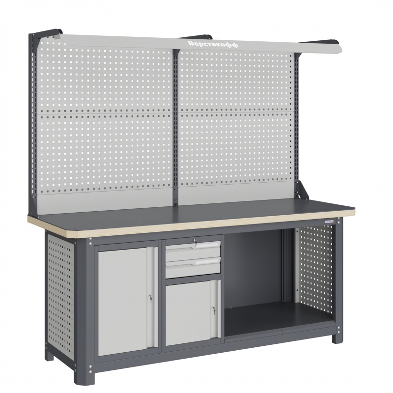 Верстак серии MECHANIC: MCN 2052.S79.11-2F состоит из столешницы шириной 1993 мм, рамы верстака, состоящей из опор, перемычек, боковых перфопанелей, малых модулей S7, S9 и двух комплектов полка-стенка SW1, двойного экрана с кронштейнами и комплектом освещения.