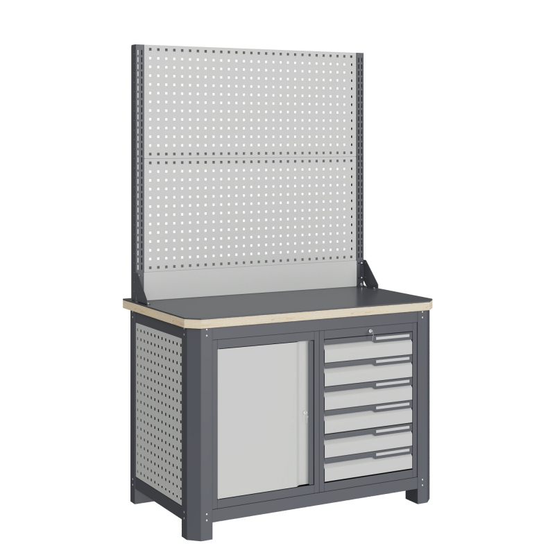 Рабочее место MECHANIC: MCN 1252.S67-1состоит из столешницы шириной 1193 мм, рамы верстака, состоящей из опор, перемычек, боковых перфопанелей, небольшого модуля с ящиками S6 и модуля S7 ( c дверцей), двойной экрана с кронштейнами.