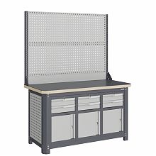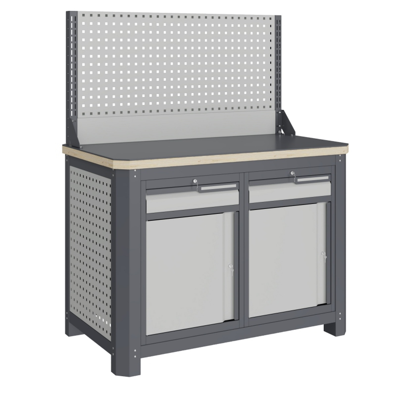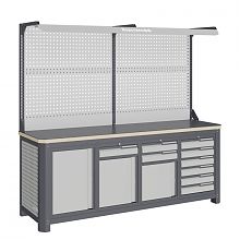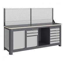 Рабочее место MECHANIC: MCN 1252.S88-1 состоит из столешницы шириной 1193 мм, рамы верстака, состоящей из опор, перемычек, боковых перфопанелей, двух небольших модулей S8 (один ящик и дверца), экран с кронштейнами.