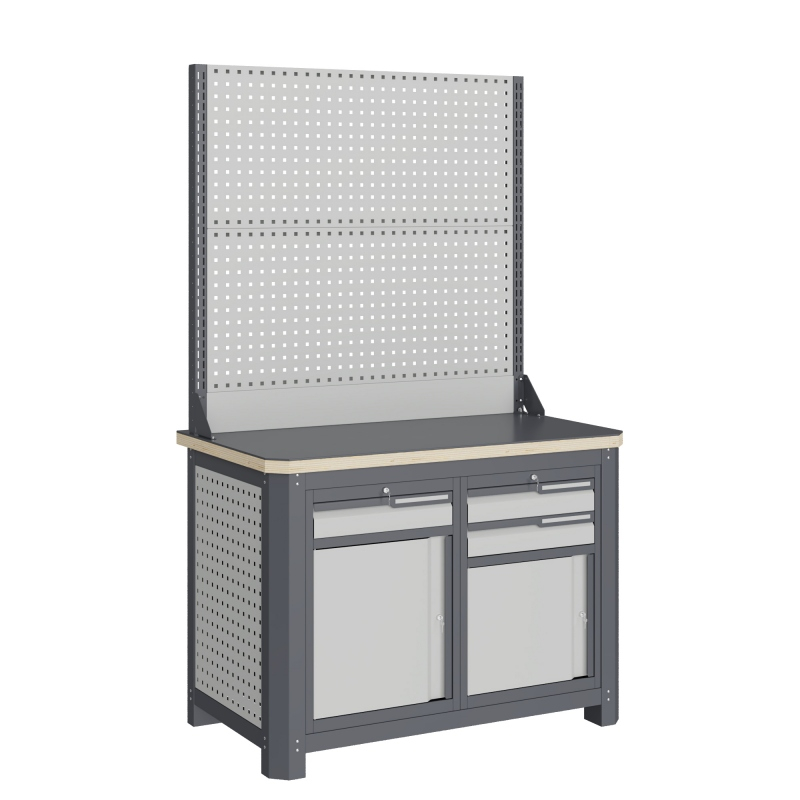 Рабочее место MECHANIC: MCN 1252.S89-2 состоит из столешницы шириной 1193 мм, рамы верстака, состоящей из опор, перемычек, боковых перфопанелей, двух небольших модулей S8 (один ящик и дверца) и S9 ( два ящика и дверца), двойного экрана с кронштейнами.