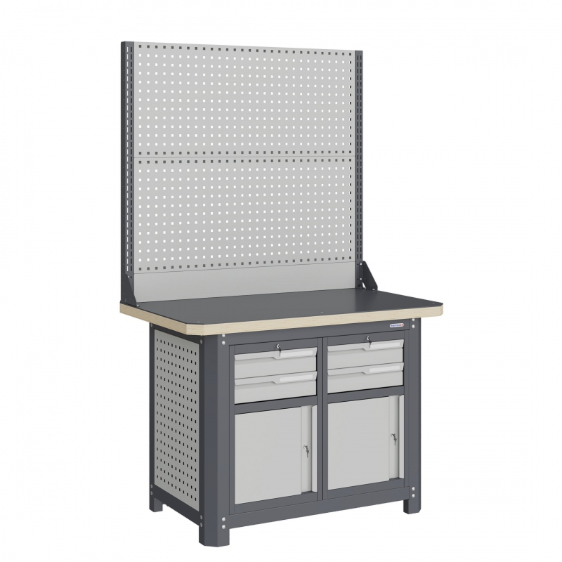 Рабочее место MECHANIC: MCN 1252.S99-2 состоит из столешницы шириной 1193 мм, рамы верстака, состоящей из опор, перемычек, боковых перфопанелей, двух небольших модулей S9 (два ящика и дверца), двойного экрана с кронштейнами.
