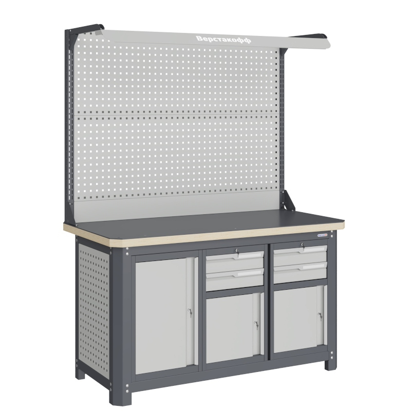 Экран (перфорированная панель) верстака выполнен с квадратной перфорацией 12х12 мм с шагом 38 мм для установки крючков, держателей и других аксессуаров. Экран крепятся к столешнице с помощью специальных кронштейнов. Максимальная масса груза, равномерно распределенного по поверхности экрана, составляет 71 кг.