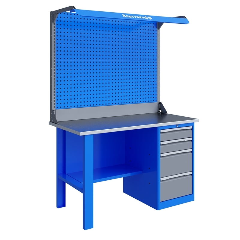 Верстак серии Technic 141.14.2-2F состоит из столешницы шириной 1396 мм, опоры, тумбы P4 с двумя малыми и двумя большими ящиками, полки-стенки, двойного экрана с кронштейнами и комплекта освещения.