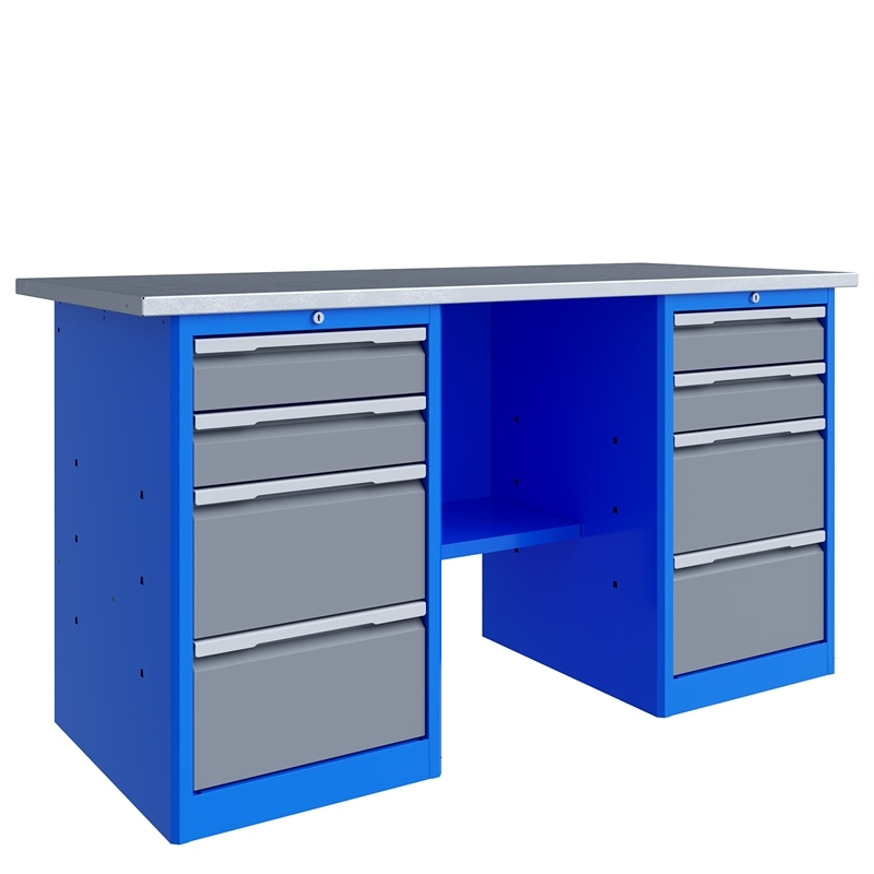 Тумбы верстаков выполнены сварными. Ящики в тумбах устанавливаются на шариковых телескопических направляющих полного выдвижения. В тумбе P4 установлено два малых и два больших ящика. Внутренние размеры малых ящиков (ВхШхГ), не более: 103 х 397 х 520 мм. Внутренние размеры больших ящиков (ВхШхГ), не более: 222 х 397 х 520 мм. Тумбы с ящиками снабжены общим центральным замком с поворотом ригеля 180 градусов и подпружиненной тягой. В комплекте два ключа с каждой тумбой.
