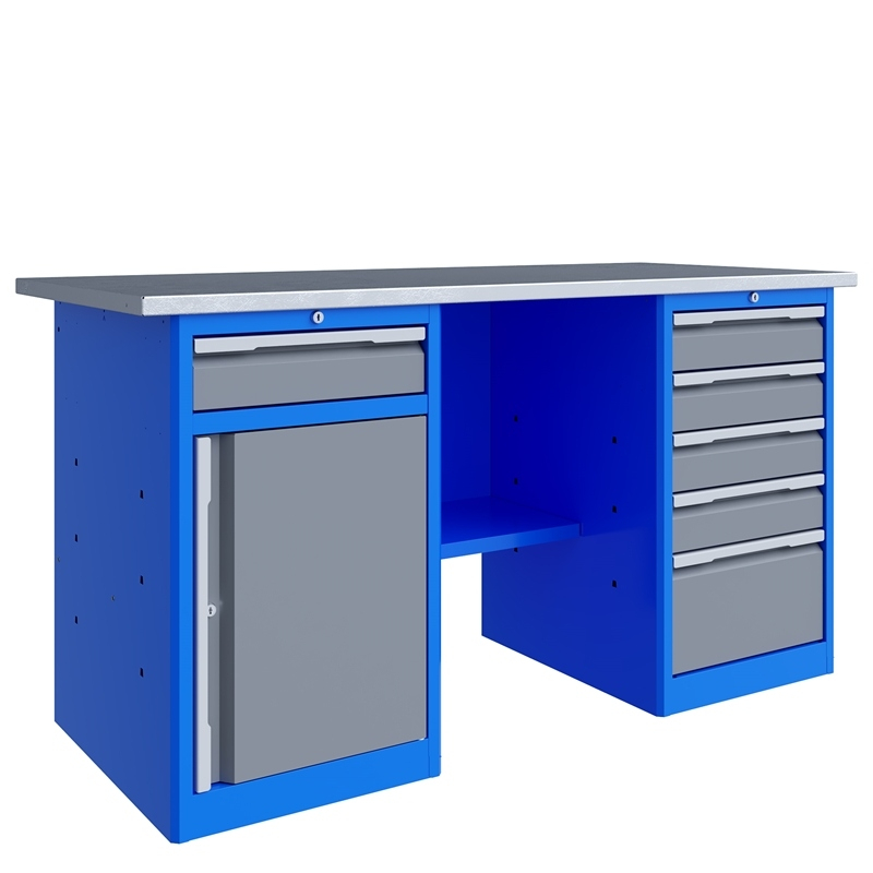Тумбы верстаков выполнены сварными. Ящики в тумбах устанавливаются на шариковых телескопических направляющих полного выдвижения. В тумбе P5 установлено четыре малых и один большой ящик. Внутренние размеры малых ящиков (ВхШхГ), не более: 103 х 397 х 520 мм. Внутренние размеры больших ящиков (ВхШхГ), не более: 222 х 397 х 520 мм. Тумбы с ящиками снабжены общим центральным замком с поворотом ригеля 180 градусов и подпружиненной тягой. В тумбе P8 установлен малый ящик и имеется отделение с дверью и одной полкой. Ящик снабжен центральным замком с поворотом ригеля 180 градусов и подпружиненной тягой. Полка устанавливается на парах специальных формованных зацепов, выполненных в боковых стенках тумбы. Имеется возможность смены стороны открывания двери. Дверь тумбы снабжена центральным замком с поворотом ригеля 180 градусов. В комплекте имеется два ключа с каждым замком.